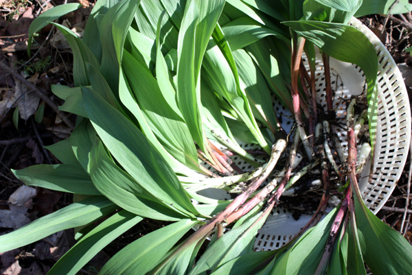 Today I went for a walk in the woods behind the cabin in search of ramps (wild onions). “Look for the large oak tree and the valley below it you may find some down there,” suggests Susan. She was right! I was surprised by how many ramps spread across the small valley. The soil was moist and dark brown. It numbed my fingers after digging for a while since it has been so cold at night. I rinsed my hands in the brook and dried them on soft moss before heading back home. Sauteed in butter with mushrooms, ramps are a special early spring treat.