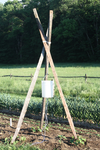 Half our tomatoes are in the greenhouse and the others are outside under a tent we built last spring to provide extra warmth and wind protection.We set up a carrot water system using a bucket with drip irrigation because as we learned from all the rain last season, carrots love water! Pole beans are planted at the base to climb up the tripod. I planted 25 raspberry plants that are doing really well showing lots of new growth. The corn germination is the best yet so we have to thin and weed it soon. Knee high by the fourth of July, Susan says. The garden is in great shape and I look forward to all it provides.