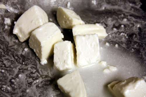 This batch I made all on my own and hung to drip the whey in my kitchen. After about two days of hanging, I cut the curd in one inch chunks, add salt, and it’s ready to sprinkle on salads and stir-fries. The chickens love the to drink the whey and I love to eat the cheese, so nothing goes to waste.