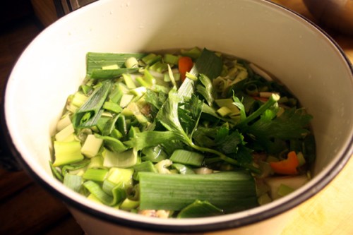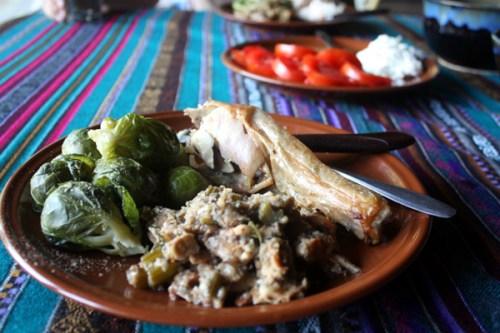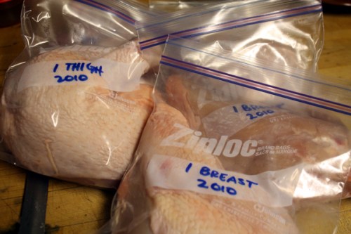 After the seven-pound birds cooled in cold water, they were moved to the fridge for at least a day before freezing. Craig offered to cook lunch for the three of us a few days later. It took two hours of roasting to cook the whole chicken. He stuffed it with the best stuffing I’ve ever had (sorry Mom). The stuffing was cooked in my chicken stock (made from the gizzards, necks, feet, and garden carrots, leeks, onions, parsley) and contained a wild mushroom a friend gave me called “chicken of the woods.”