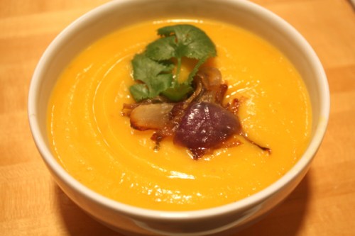¡La calabaza! I made a butternut squash soup with caramelized onions and cilantro to garnish. It was simple: boil potatoes, carrots, and squash until soft then I blended it with melted butter, maple syrup, and a little water. After reheating it on the stove, I added salt and pepper to taste. ¡Que rico y delicioso!