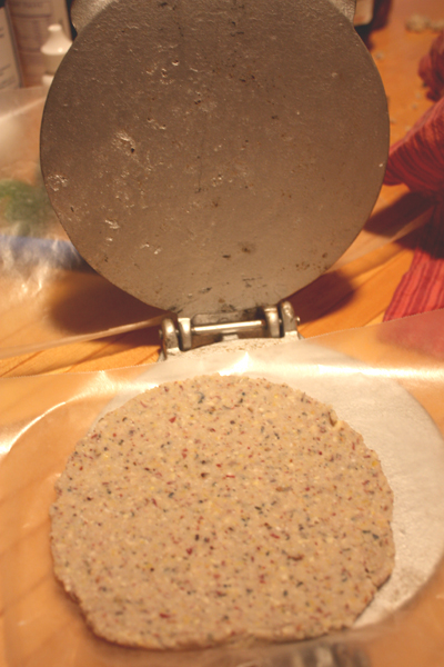 These were the most beautiful multi colored tortillas I’ve ever seen. Specks of blue, purple, yellow, pink, and red. We borrowed a friend’s tortilla press and Craig lightly fried them in oil. Mark shredded the queso fresco, a soft white cow cheese.
