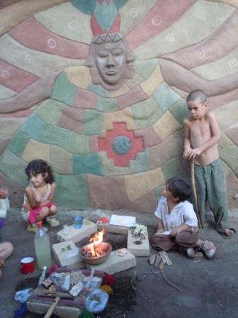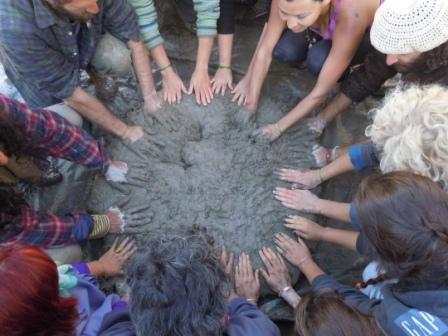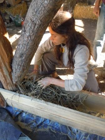 The site was bustling with people pushing wheelbarrows, making straw and mud bricks, installing solar showers, setting up a huge geo dome, putting together a tipi, finishing walls with clay, and mixing large mounds of adobe. All week long would be like this- including workshops, lectures, music, yoga, massages, eating at picnic tables outside, mate breaks, and playing in the river. We were essentially learning how to build a community out of earthen materials and having a lot of fun in the process.