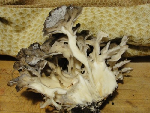 Mitaki, or hen of the woods, grow under red oaks trees. They are very medicinal, high in vitamins, and boost the immune system. My mom spotted one growing on our front lawn beneath our ancient oak.