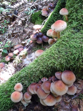 Puffballs pop up on mossy logs, not to be confused with the poisonous puffballs that emit dust when you step on them.