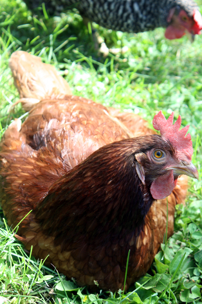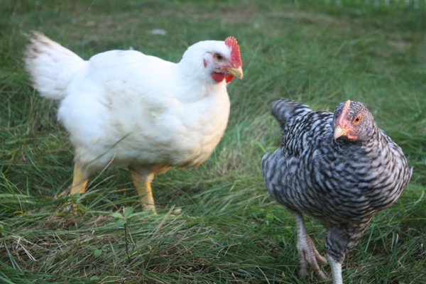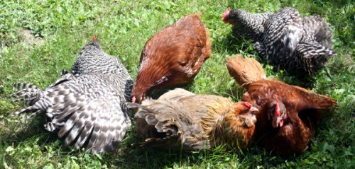 Since introducing him to the hens, he has learned to lead a more active lifestyle. At first, the hens terrified him. He stayed by the woodpile all day waiting for me to feed him grain. The hens would run over to check out what special treatment I gave him, devoured his food, and tipped over his water. The next day he ventured out to the bush and hid in there until nightfall. By day five he figured out he wasn’t quite as small as he thought. He followed the girls around leaving a 10 foot safety zone. Now, he knows the route and even has a girlfriend. “The Dude and Dud Duo” stand together all day. Americauna (the hen that doesn’t lay her blue eggs) is being courted by Einstein. He’s actually very sweet for a rooster, so far. But, if he starts pecking the hens or showing any aggressive behavior towards me, he will become soup. End of story.