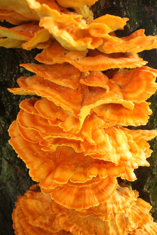 Last week I passed up 15 pounds of Chicken of the Woods (the golden orange shelf mushroom seen in the these photos) because the property owner felt we ought to leave them for their beauty. It wasn’t easy to leave over $100 worth of bounty. But, I respected his decision and felt better about it in the end. Greed has caused most of the damage in the world today. Rather than betraying my neighbor, I took lots of photos to share with you all.