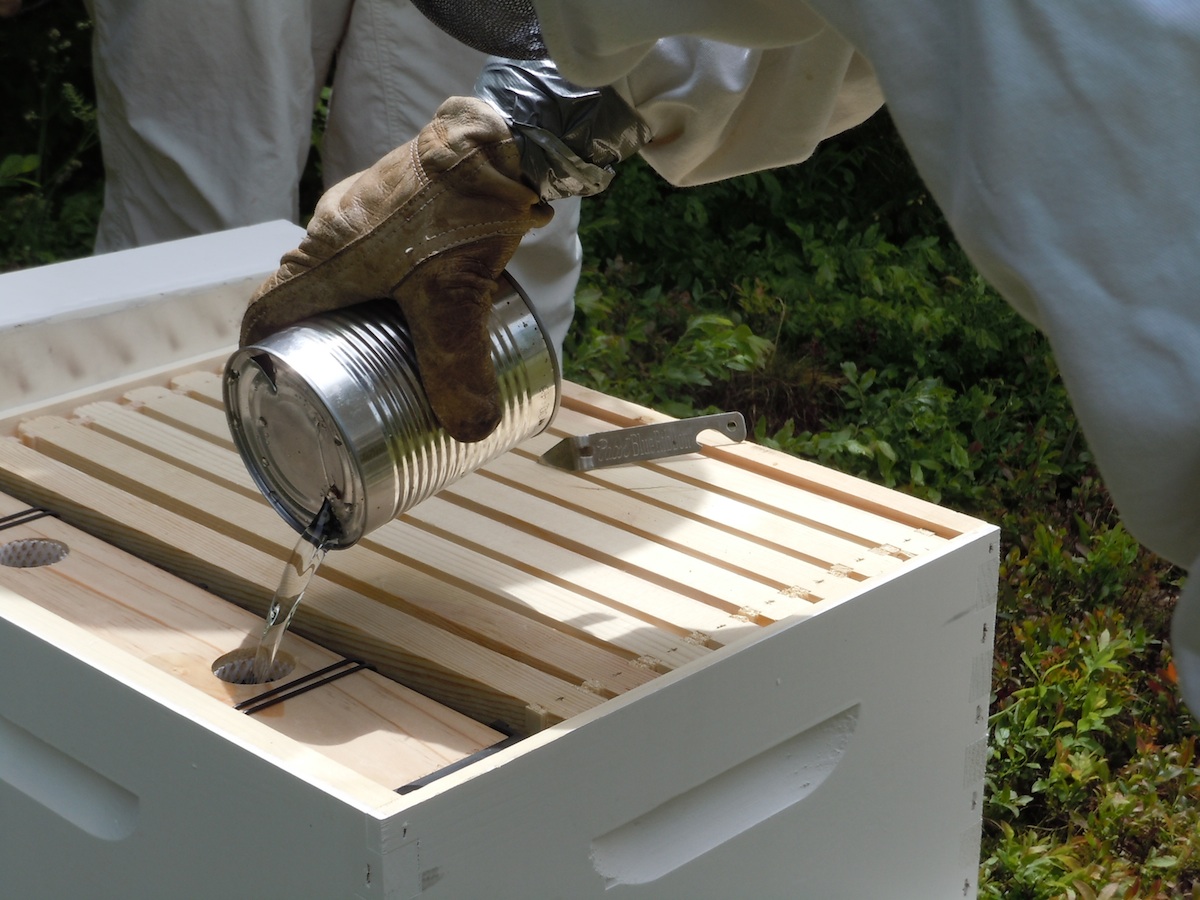 First, we added sugar water (or  you can use honey) to the hive to give the bees something to start with and draw them into their new home.