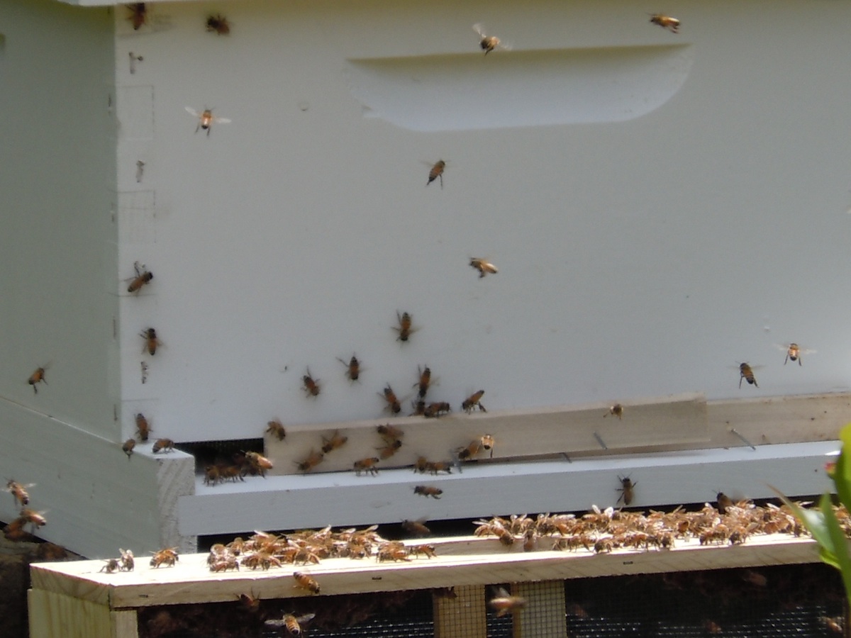 welcome beesAll the other bees joined her in the hive by swarming and within a few hours, they all settled down. Home sweet home! I can hardly wait for honey this fall.